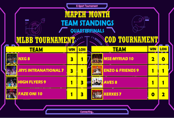 JuanSci MAPEH Club eSports is the biggest, anticipated and the most challenging activity that the club did. The JuanSci MLBB (Mobile Legends: Bang Bang) and CODM (Call of Duty Mobile) Tournament are the very first official eSports that SJCSHS had. Therefore, it is indeed difficult due to new adjustments and because of the long duration of this event. The tournament was held for over 3 weeks. This was planned and launched by the club to let the students have fun while taking part in an important event. The participant's line-up of 5 main and 2 reserved players, for both tournaments, is gathered in a form of registration. The club officers live-streamed the games from elimination to finals on their Facebook page to let the audience watch the game, and to keep them notified about the action during the game. After numerous arduous extermination, JYRS Intranational won the MLBB Tournament meanwhile, AVES triumphed in CODM Tournament.